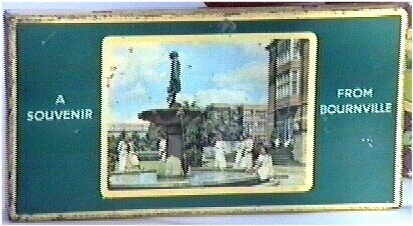 We believe this tin dates from the 1920's. It shows Cadbury workers (all female in white smock dresses) enjoying a break at a fountain by the factory. The fountain is visible (or at least identifiable) in all the other pictures.