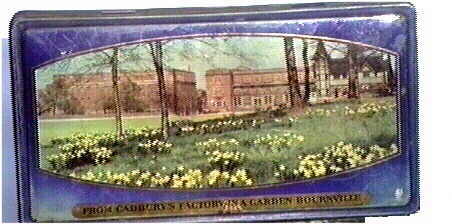 It's the Bournville factory which features on the tins we've collected, and we believe were given to groups who toured the factory as they left, as a momento of their visit. These must have begun in the 1920's as the first of the series of identically sized tins dates from this era.
