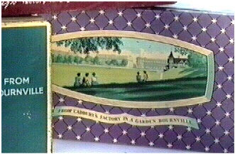 This tin dates from the 1930's. The gap between the two factory buildings can be identified in the 1920's picture above by the angled bow windows. With apologies for the quality of the picture, the statue can just be seen on the original. The words 'From Cadbury's factory in a garden' which originate here are used on the future tins.