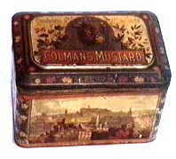 This Colman's Mustard tin is an example of those which would have sat on the counter in grocers' shops at the turn of the century, selling small amounts of powered mustard, which was then mixed with water at home to make mustard for meats. Given that there was little refrigeration, the mustard may often have been a necessity with somewhat 'high' cold meats, which were a few days old. In fact we're doubly lucky as we have found two of these tins - different times and different places.